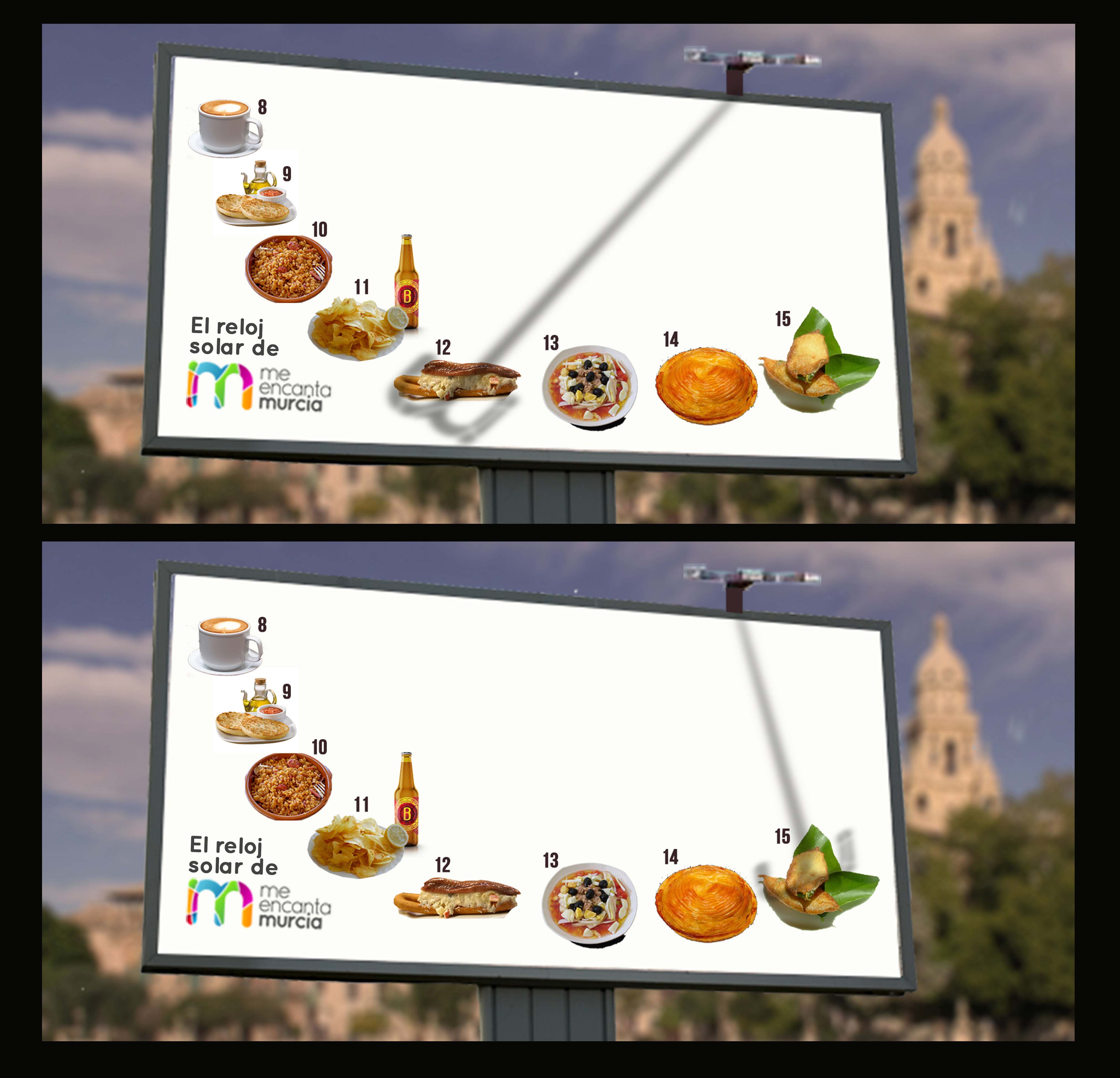 En Me Encanta Murcia hemos tirado de creatividad para crear un reloj solar especial, basado en la gastronomía típica de la Región de Murcia, donde a cada hora solar te marca la tapa recomendada.
